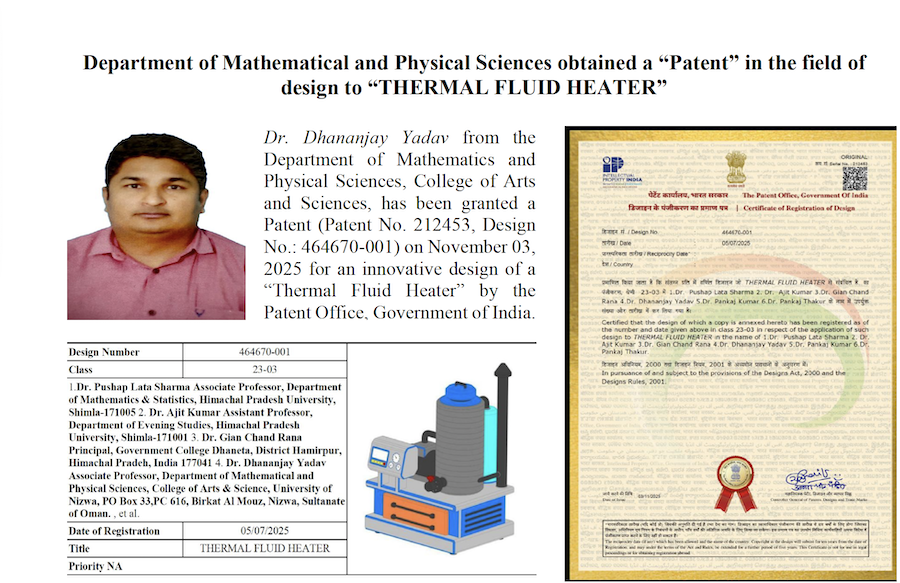 شاركت جامعة نزوى في مشروعٍ بحثيٍّ دوليٍّ نوعيٍّ أثمر عن ابتكار سخّانٍ للسوائل الحرارية، حاز رسميًّا براءة اختراع من مكتب براءات الاختراع في الهند بتاريخ 3 نوفمبر 2025.