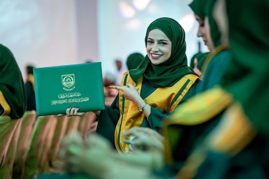 وتوجه الدكتور في كلمته للخريجين والخريجات بالقول: "أيها المعلمون والمعلمات، لقد اخترتم طريقًا يسلكه العظماء، طريقًا يُقاس بالأثر والبقاء؛ فأنتم لستم ناقلي معلومات، بل أنتم صانعو العقول، وأنتم من يبني الشخصيات ويرفع راية الأوطان. إنه لجدير بكم، وأنتم لذلك أهل، أن تنقلوا ما تعلمتم من معارف ومبادئ وقيم إلى طلبتكم الذين ينتظرون منكم كلمة تشجيع أو نظرة تقدير. تذكروا أن الفرق الذي تصنعونه في حياة طالب واحد قد يشكل فرقًا في مستقبل أمة بأكملها".