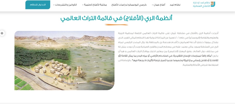 ويعد نظام لمد لإدارة الأفلاج العمانية الذي يعمل عليه كرسي اليونسكو لدراسات الأفلاج وعلم المياه الاجتماعي بالشراكة مع وزارة الثروة الزراعية والسمكية وموارد المياه والمدعوم من قبل صندوق التنمية الزراعية والسمكية من الأنظمة المتخصصة التي تعمل على توفير حزمة واسعة من الخدمات الرقمية المتعلقة بالأفلاج العمانية، إذ يمكِّن النظام من إدارة الأفلاج العمانية إدارة شاملة تغطي الجوانب الفنية والتنظيمية والمالية، إذ يتيح النظام توثيق مواقيت الري وتسجيل الحصص المائية بدقة عالية، مع تقديم تنبيهات فورية للملاك والمستخدمين عن أوقات الري، ويشمل خدمات الإدارة المالية المتعلقة بتحصيل الإيرادات وصرف المصروفات، وإدارة الأوقاف المرتبطة بالفلج، وتنظيم عمليات المزايدة على وفق إجراءات واضحة وموثقة، إضافة إلى ذلك يوفر النظام إمكانية رسم مسارات الأفلاج وتوثيقها رقميا، وغيرها من الخدمات.