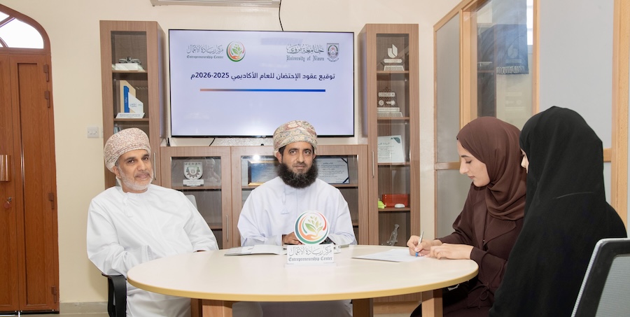 وقّع مركز ريادة الأعمال بجامعة نزوى يوم الخميس الموافق 4 ديسمبر الجاري أربع عشرة اتفاقية لاحتضان مجموعة من المشاريع الطلابية ضمن وحدة حاضنات الأعمال؛ وذلك في إطار جهود الجامعة لدعم الابتكار وتشجيع الطلبة على تأسيس شركات ناشئة تسهم في تطوير منظومة ريادة الأعمال بالجامعة وفي رفد سوق العمل الوطني.