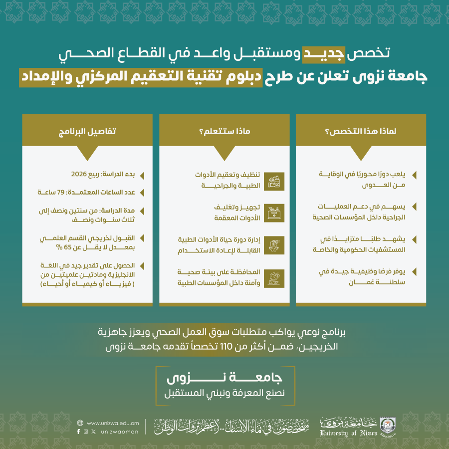 أعلنت جامعة نزوى عن طرح تخصص جديد بعنوان "دبلوم في تقنية التعقيم المركزي والإمداد"؛ وذلك بعد موافقة وزارة التعليم على تنفيذ البرنامج ابتداءً من ربيع 2026م. ويُعد هذا التخصص ثالث برنامج تعلن عنه الجامعة في شهر واحد، بعد إعلانها عن طرح ماجستير تكنولوجيا التعليم بنظام التعليم المدمج، ودكتوراة الفلسفة في المناهج وطرائق التدريس؛ ليضاف بذلك إلى أكثر من 110 تخصص متاح في الجامعة.