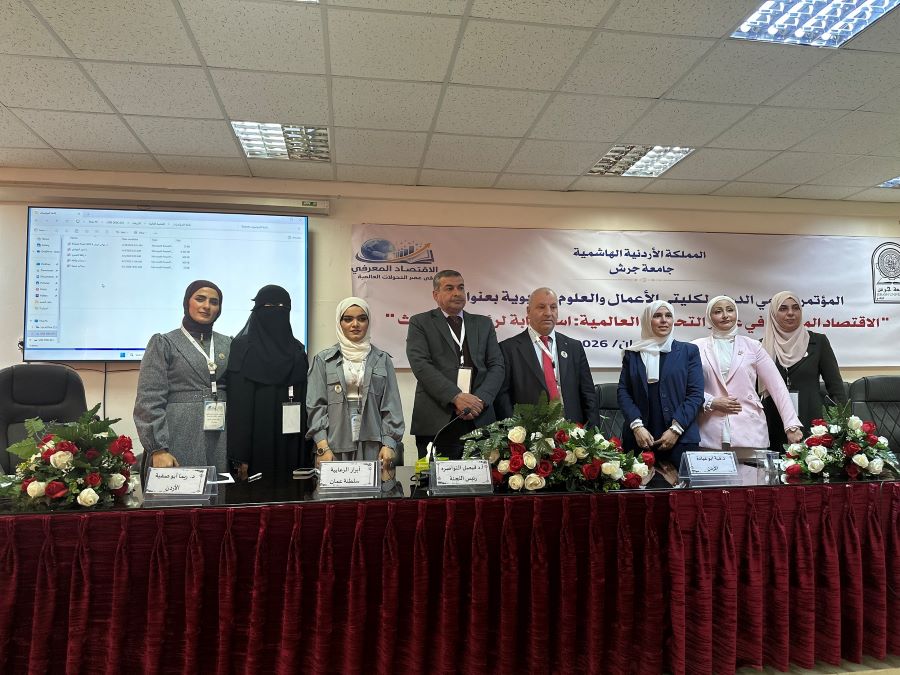 <p style="text-align: justify;" dir="rtl"><span style="font-size: x-large; font-family: arial, helvetica, sans-serif;">شاركت كلية العلوم والآداب ممثلة في قسم التربية والدراسات الإنسانية في المؤتمر العلمي الدولي الذي نظمته كليتا الأعمال والعلوم التربوية في جامعة جرش في المملكة الأردنية الهاشمية بعنوان "الاقتصاد المعرفي في عصر التحولات العالمية: استجابة لرؤى التحديث"، في الفترة من 6 – 8 أبريل 2026. تحت رعاية دولة رئيس مجلس الأعيان فيصل عاكف الفايز، وبحضور وزير الاقتصاد الرقمي ووزير التنمية الاجتماعية ووزير الشباب والرياضة ووزير البيئة، وبمشاركة واسعة من الباحثين والأكاديميين من مختلف الدول العربية والدولية.</span></p>